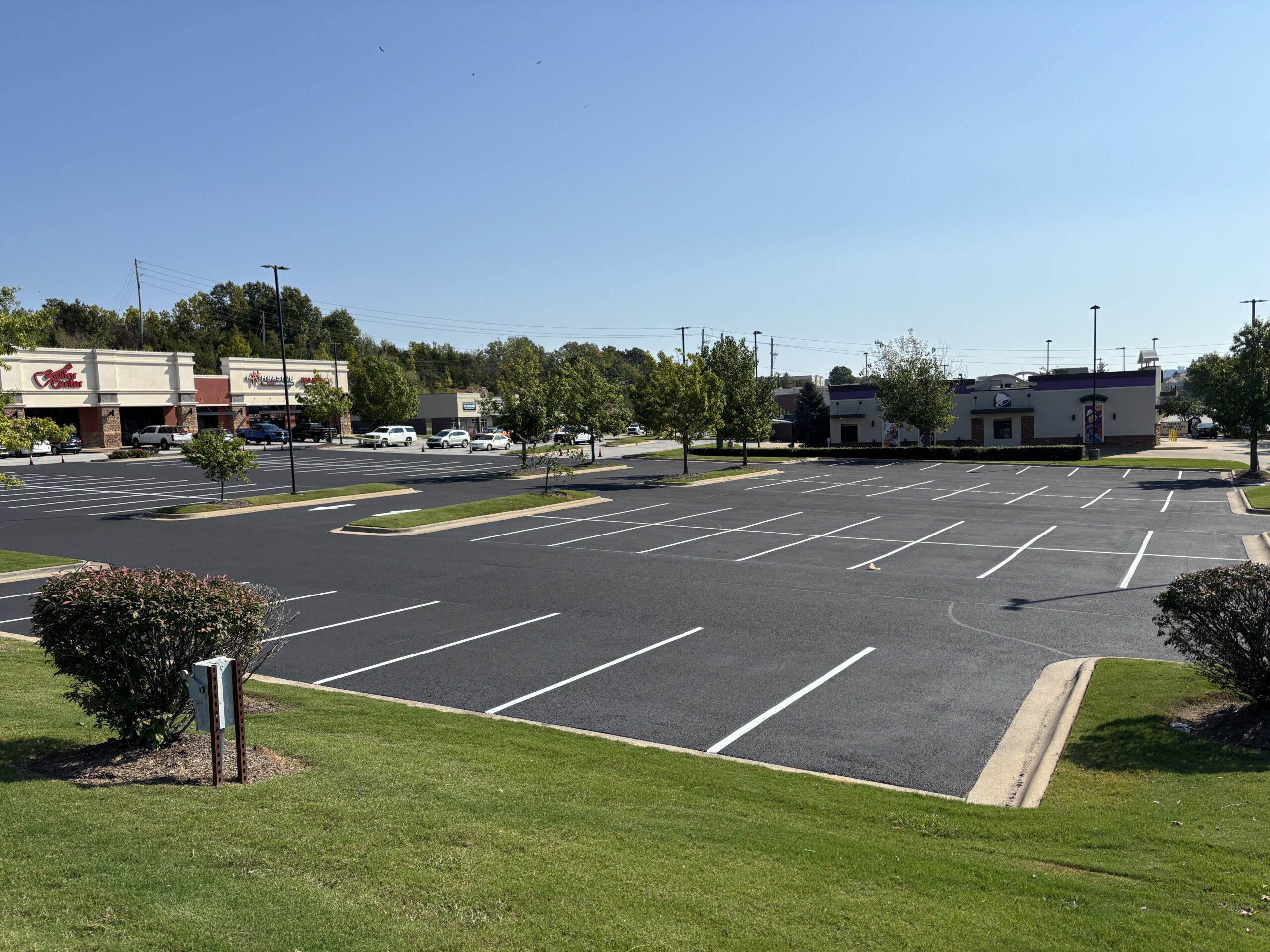 Entrusted with the complete pavement maintenance and restriping of the shopping center, including thorough surface cleaning, crack preparation, and the application of a single coat of sealcoat installed in controlled sections. Upon completion of the sealcoating process, the project included full lot restriping, installation of ADA-compliant handicap parking spaces, custom pavement stenciling, and repainting of all fire lanes and curbs. Work was carefully sequenced to ensure proper material curing, clear layout accuracy, and a clean, professional finished appearance while maintaining operational continuity for the property.